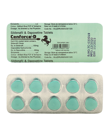 - Cenforce D wird zur Behandlung von erektiler Dysfunktion und vorzeitiger Ejakulation verwendet. Das Medikament ist eine Kombination aus Sildenafilcitrat, einem PDE5-Hemmer, und Dapoxetin, einem selektiven Serotonin-Wiederaufnahmehemmer (SSRI).